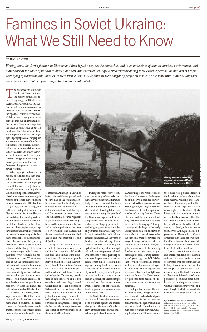 “Towards an Animal Sensitive History of Famines: Animals, the Environment, and Soviet Famines in Ukraine.” East/West: Journal of Ukrainian Studies. Special Issue: Beyond Anthropocentrism in Ukrainian Studies (ed. by Tanya Richardson and Darya Tsymbalyuk) (2025) (forthcoming, pre-print LINK )
